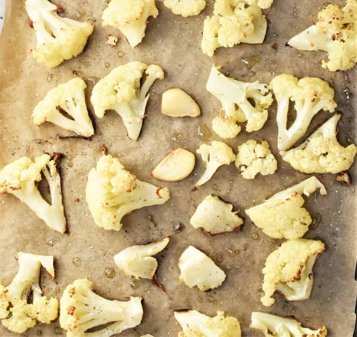 - Season and coat the cauliflower and garlic cloves with approx. 1 tablespoon of the oil (a pastry brush works well here). Arrange on top of the baking sheet in a single layer and roast for 20 minutes. Remove from the oven and set aside to cool.