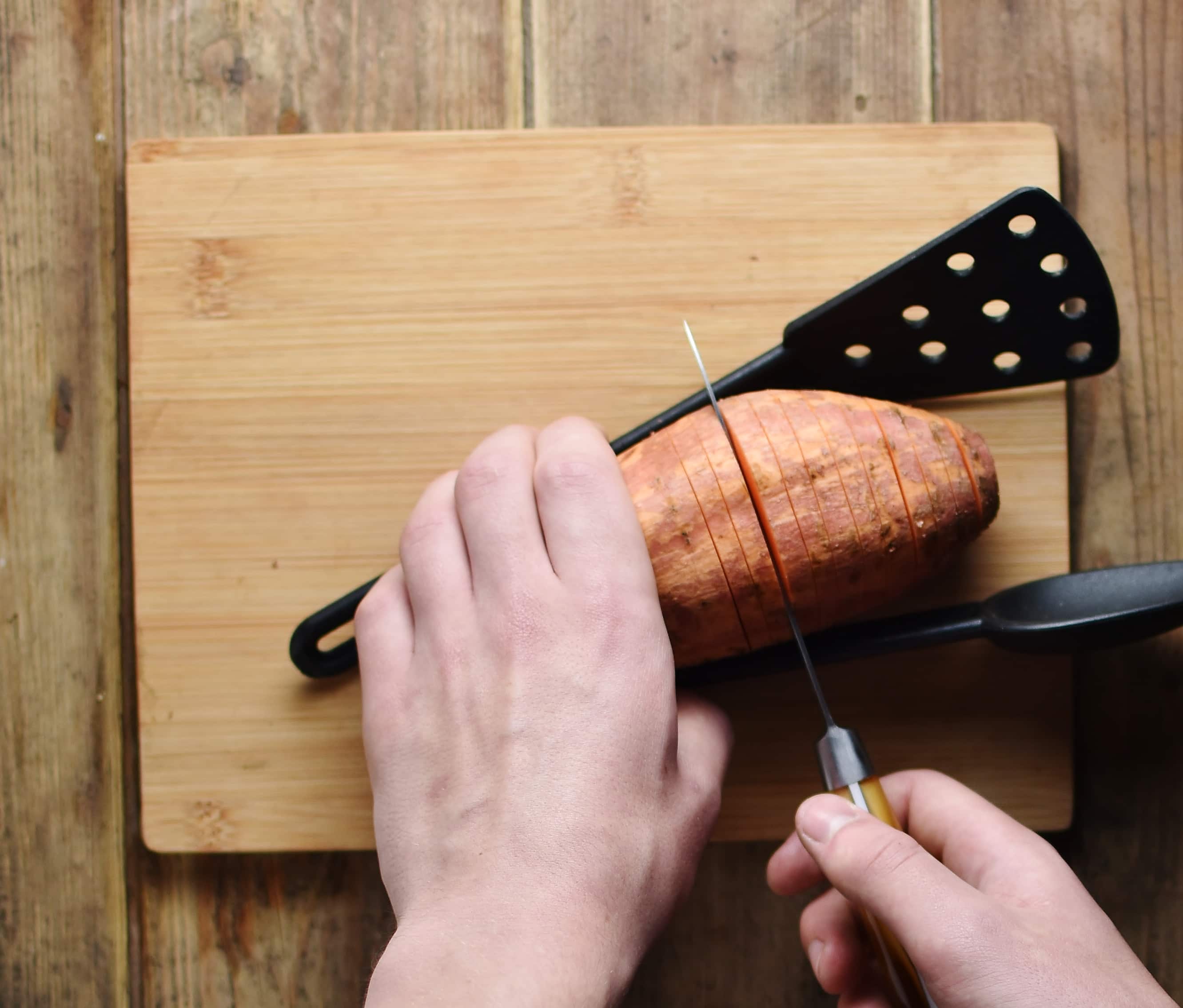 The hasselback preparation method involves thinly slicing sweet potatoes along their width 3 quarters of the way through so the slices are held at the base. This allows to coat the sweet potato with herbs and spices in between the slices rather than just over the top.