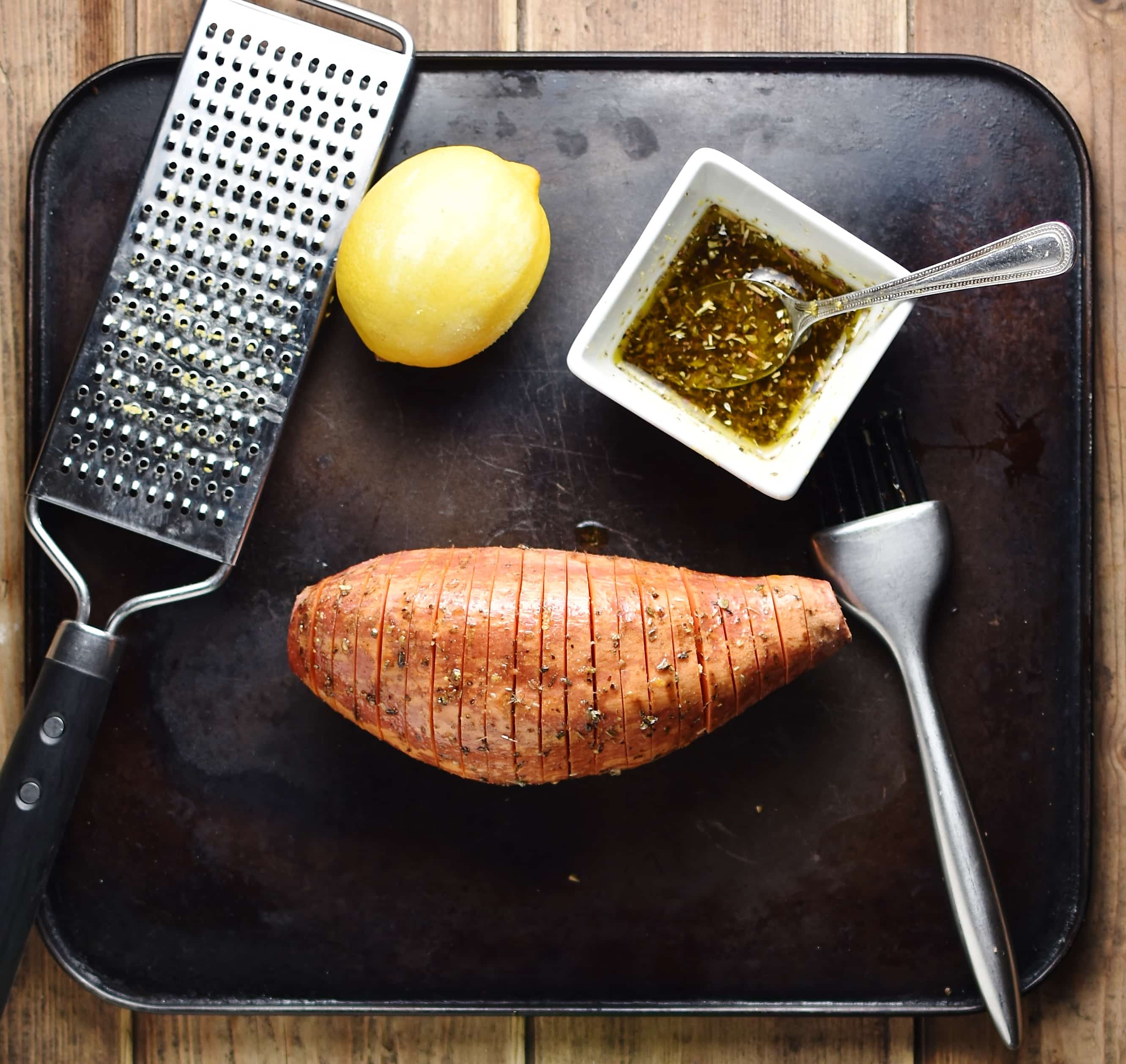 3. Combine the herb dressing ingredients and using approx. half of the mixture drizzle over the sweet potatoes, ensuring it gets in between the slices (use a basting brush to do this).